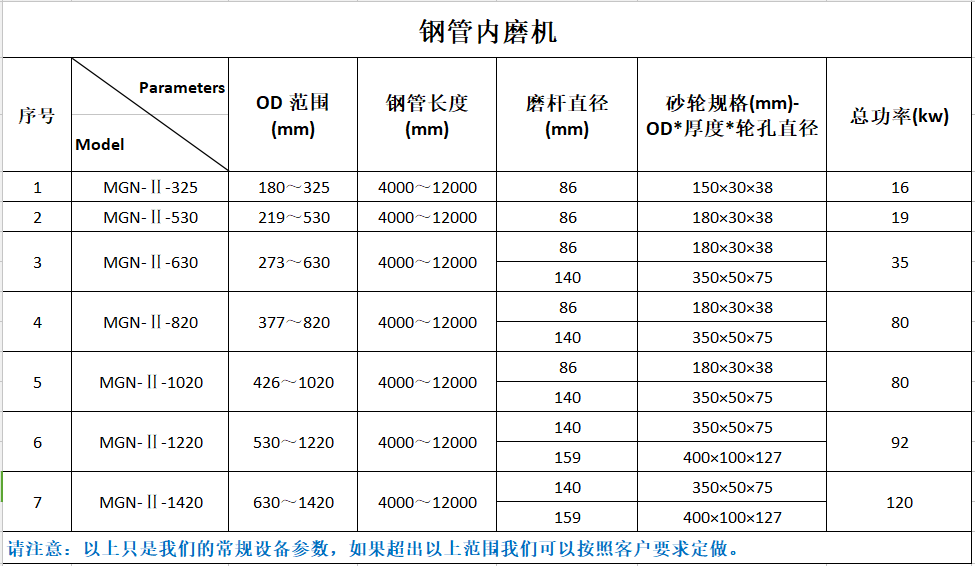 1)重型钢管内圆修磨机:长磨杆(砂轮主轴φ60)外径为φ159mm;
