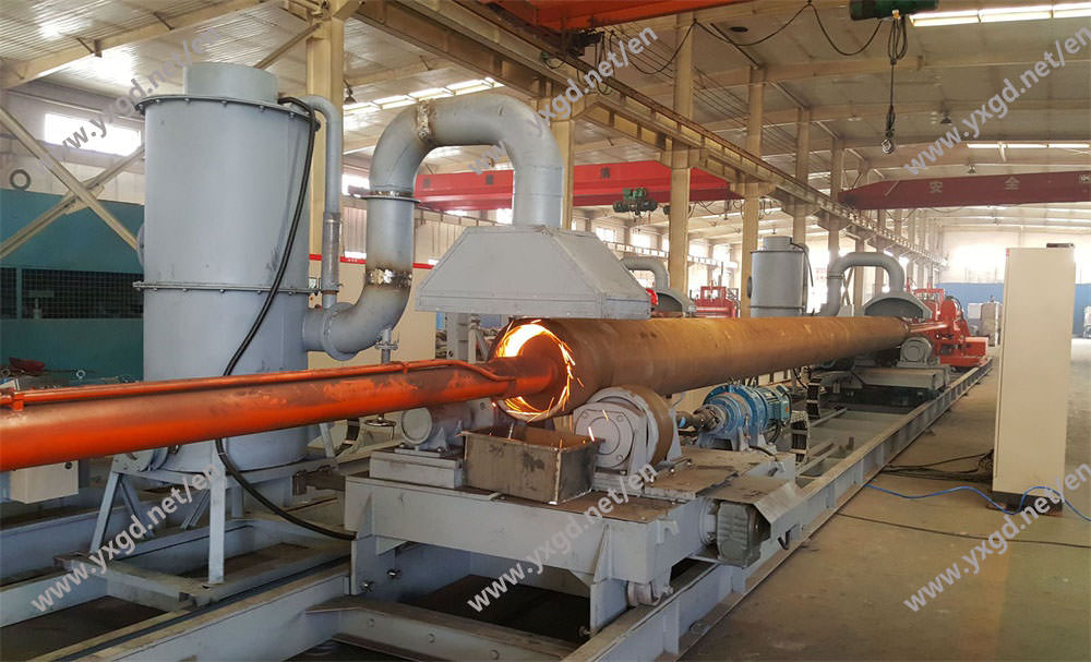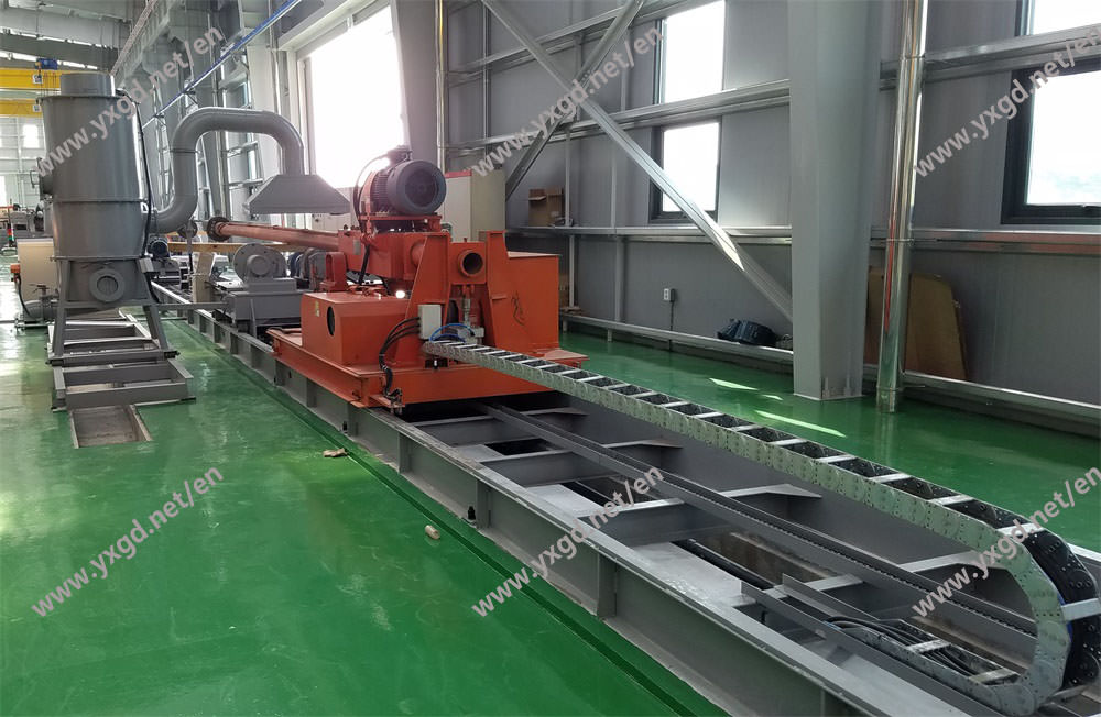 四、设备结构:底架道轨、磨头小车、钢管旋转辊道、湿式离心除尘装置(或干式除尘器)。