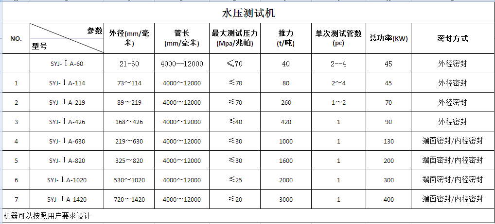 1、*大试验压力:5~70MPa(根据用户对钢管直径和试压压力的需要设计与制造该设备);