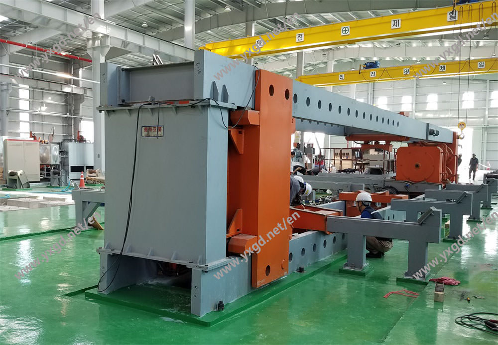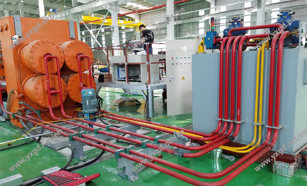 三、设备结构:设备机座、止推板、压紧推板、平衡压力大梁、主油缸压力机头、钢管托料装置、液压控制系统、电控柜、操作台(触摸屏)、水压控制系统、PLC编程智能控制系统等组成。