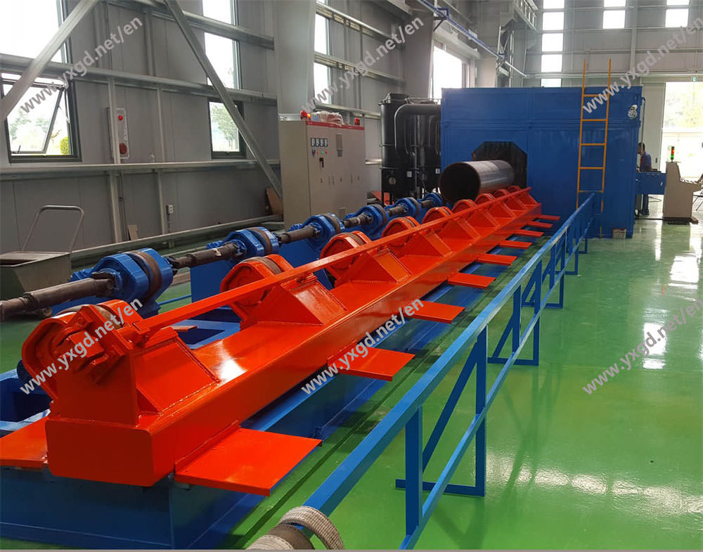 三、设备结构:设备底架装置、磨头装置、钢管旋转运行辊道、除尘隔音房,湿式除尘器(干式除尘器)、自动补水系统、钢管翻板液压上下料装置(根据用户要求而定)、气动系统、电气智能控制系统(包括PLC、HMI编程控制设备系统)和监控系统、操作台(触